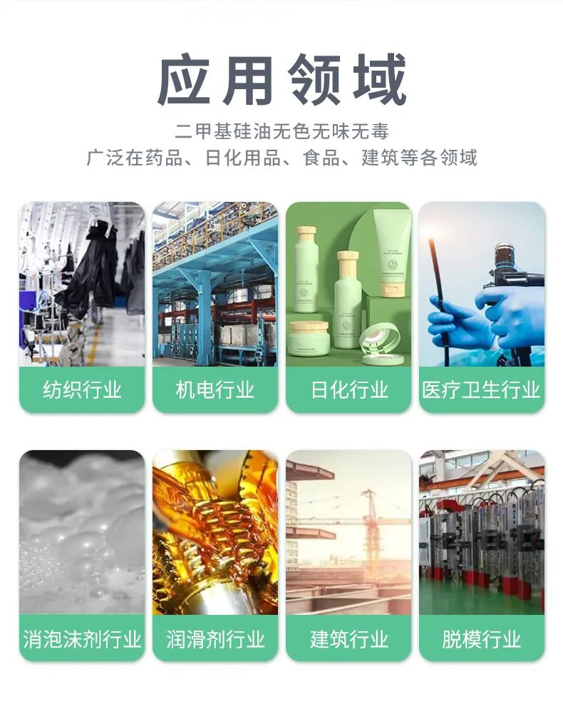 硅油及其衍生物的主要应用为:脱膜剂、减震油、介电油、液压油、热传递油、扩散泵油、消泡剂、润滑剂、疏水剂、油漆添加剂、抛光剂、化妆品和日常生活用品添加剂、表面活性剂、颗粒和纤维处理剂、硅脂、絮凝剂。